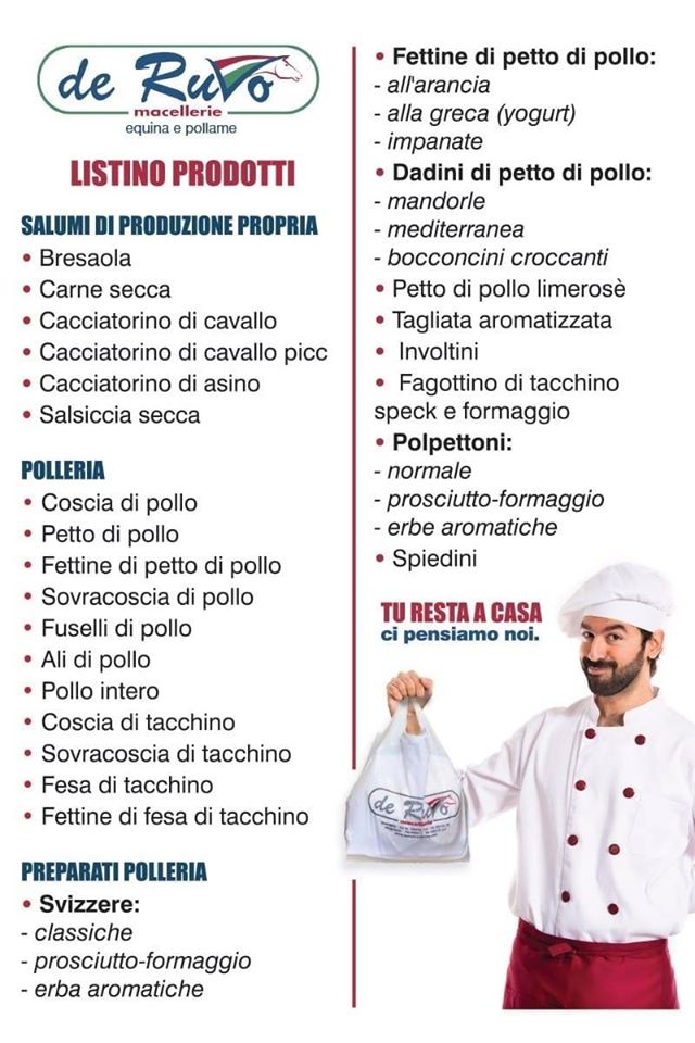 La lista dei prodotti a domiclio è sulla sulla pagina Facebook De Ruvo Macellerie, dove si trova anche il video del banco.