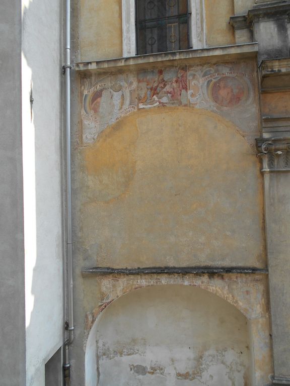 Sulla parete esterna della chiesa dal lato dove terminava il sentiero é appena visibile una ‘danza macabra’, l’affresco dove si alternano individui di diverso ceto sociale che ballano uniti a macabri scheletri. Rovinata dall’inclemenza degli elementi naturali la rozza pittura murale quando nel 1966 venne esaminata da un esperto d’arte come Forneris raffigurava uno accanto all’altro popolani e potenti, una figura maschile con in capo una corona di spine, angeli, demoni e scheletri.