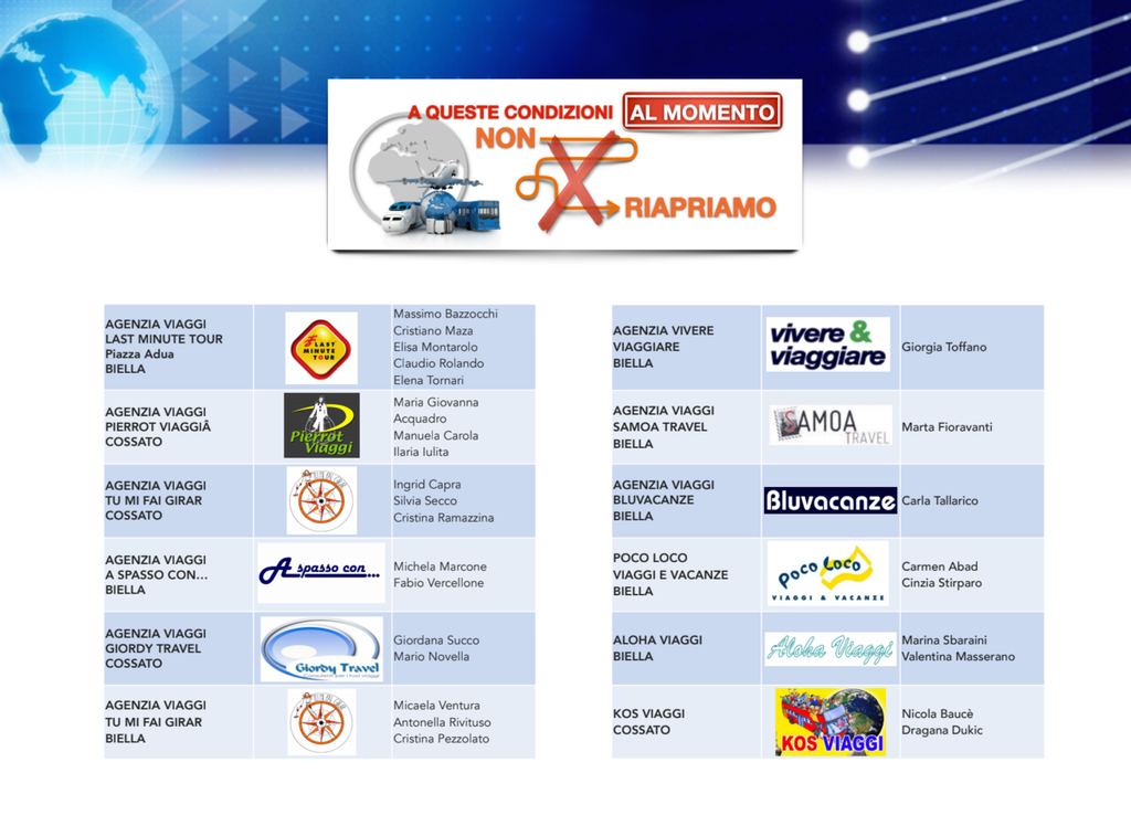 Oggi proponiamo la lettera al direttore di 11 agenzie biellesi "alcune di esse snobbate" per il contributo solo per una questione di codice Ateco. "Continua la fase 2 e lunedì qualche commerciante di sicuro si emozionerà al primo cliente che entrerà in negozio. Tutto questo però non riguarda le Agenzie di Viaggio che fanno parte delle attività più colpite da questa crisi come tutto il turismo. Oggi è il tanto atteso giorno della riapertura, tantissime attività riaprono le loro porte ed iniziano, seppur con delle forti limitazioni, a rivendere i propri prodotti e servizi. Tutto questo però non riguarda le Agenzie di Viaggio che potrebbero aprire come gli altri negozi al dettaglio ma che, in provincia di Biella come in altre provincie italiane, hanno costituito gruppi e hanno, tutte di comune accordo, deciso di restare chiuse al pubblico per dare il segno che qualcosa non va e che deve essere risolto. Vogliono, unendosi, poter sensibilizzare opinione pubblica ed istituzioni. A tutto questo si aggiunge la delusione di alcuni operatori che, nonostante la battaglia fatta in Regione nelle settimane scorse, non riceveranno il contributo di 1500 euro a fondo perduto previsto dal Decreto Riparti Piemonte poiché il loro codice Ateco 82.99.99 non è stato inserito nell’elenco delle attività che ne hanno diritto.