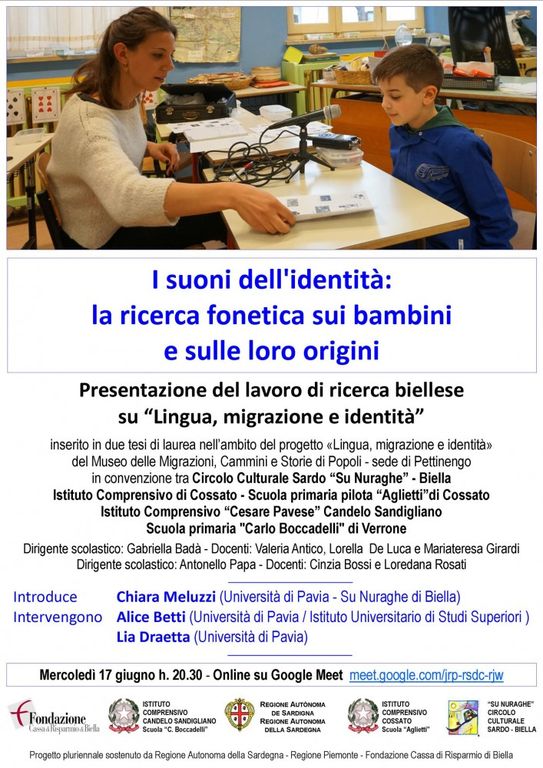 Il 17 giugno alle 20:30 sulla piattaforma Google Meets (link: meet.google.com/jrp-rsdc-rjw) si terrà l’incontro dal titolo: “I suoni dell’identità: la ricerca sociofonetica sui bambini e sulle loro origini”.