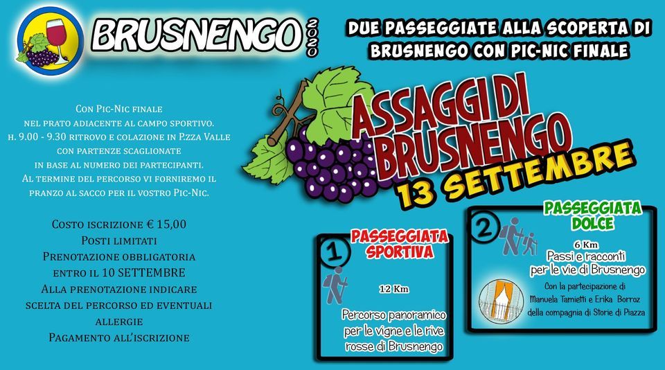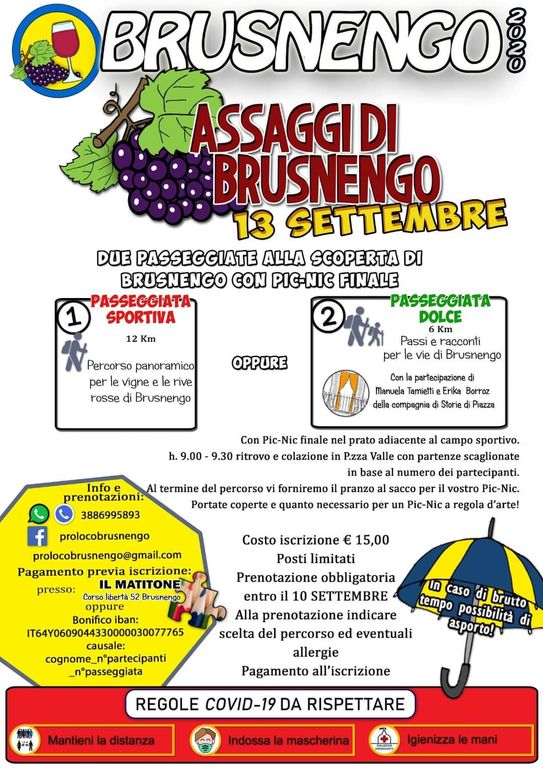 Per partecipare è obbligatoria la prenotazione entro giovedì 10 settembre tramite la pagina Facebook Pro Loco Brusnengo, oppure chiamando il 3886995893 (anche whatsapp e telegram), oppure scrivendo a prolocobrusnengo@gmail.com .