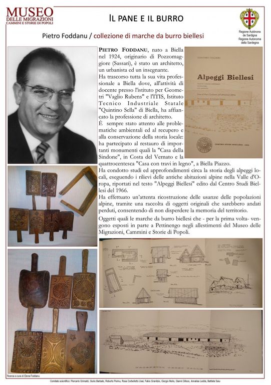 Il Museo delle Migrazioni di Pettinengo, inserito anche quest’anno nella Rete Museale Biellese, ospita al suo interno una collezione di marche da burro biellesi davvero unica. Gli stampi - insieme a molti altri oggetti della cultura materiale contadina - sono stati raccolti da Pietro Foddanu, noto architetto e insegnante di Biella di origini sarde, e poi alla sua morte - avvenuta nel 2011 – messi a disposizione del Circolo Culturale Sardo Su Nuraghe, di cui per anni è stato amministratore. Nel corso della sua vita di ricercatore e divulgatore della tradizione, Foddanu ha condotto studi approfonditi sulle case rurali alpine, eseguendo anche rilievi di antiche cascine, baite e alpeggi della Valle Oropa e del Sessera. Suoi accurati disegni sono stati pubblicati nel 1966 nel libro Alpeggi Biellesi, di Giacomo Calleri.