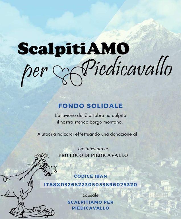 “Quest'anno ha deciso di metterci proprio alla prova ma non è nostra abitudine stare con le mani in mano – spiegano dalla Pro Loco di Piedicavallo - Questa volta però abbiamo bisogno ancora di più del vostro aiuto per ripartire e ricostruire insieme quello che l'alluvione ci ha portato via. ScalpitiAMO tutti insieme per Piedicavallo”. In locandina i riferimenti per le donazioni.