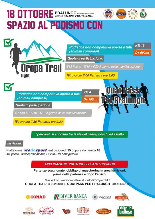 Domenica 18 ottobre si darà il via a due podistiche non competitive a passo libero, in cui si potrà scegliere tra due percorsi: Oropa Trail Light, una versione più leggera della classica ‘Oropa Trail’ degli scorsi anni, con una lunghezza di 16 chilometri e 690 D+, con partenza dal centro di Pralungo e che arriverà a toccare Pian Del Lupo e rientro in paese; il secondo percorso è chiamato “Quat Pass Par Pralungh“, adatto a tutti, con un dislivello di poco più di 100 metri che conduce i partecipanti alla scoperta di angoli “esi e cort” di Pralungo, passeggiando tra “bosch, asfalt ed erborin”, che si potrà percorrere camminando o correndo anche in compagnia dei propri amici a quattro zampe.