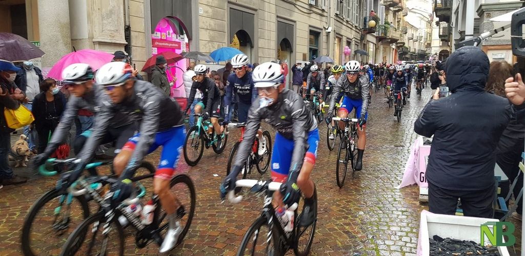Biella si preparava da settimane a questo momento e nemmeno la pioggia ha fermato l'emozione che ogni volta la corsa rosa sa regalare. Presenti al via il sindaco di Biella Claudio Corradino e l'assessore regionale Chiara Caucino.