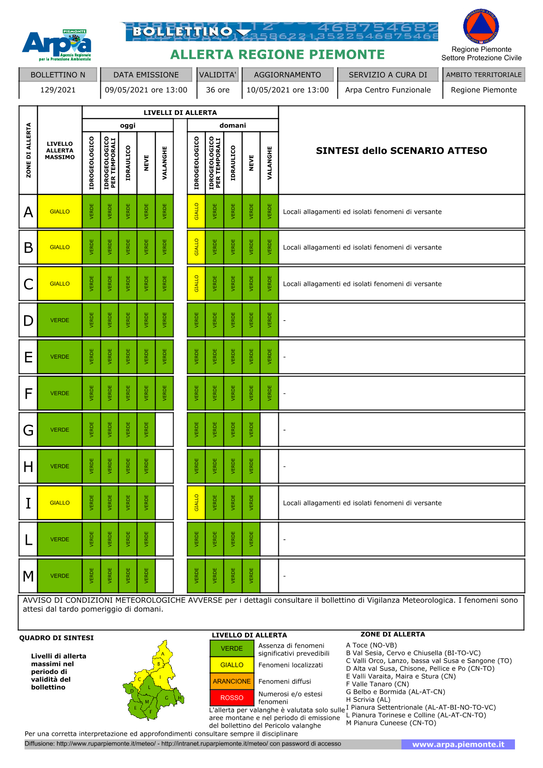 A comunicarlo l'Arpa Piemonte attraverso una nota sul proprio sito: “Una vasta e profonda saccatura di origine atlantica, in graduale discesa dalle Isole Britanniche verso il bacino occidentale del Mediterraneo dal pomeriggio di ieri, convoglia sul Piemonte intensi flussi umidi meridionali responsabili di diffuse condizioni di maltempo sulla nostra regione da oggi fino a martedì. Le precipitazioni interesseranno la fascia montana e pedemontana alpina già da ieri sera, ma i valori saranno deboli con picchi al più moderati sulle zone nordoccidentali. Da oggi pomeriggio il peggioramento si estenderà a tutta la regione con precipitazioni diffuse moderate, anche a carattere di rovescio e temporale, localmente forti o molto forti sui settori pedemontani settentrionali e nordoccidentali. Condizioni in ulteriore peggioramento sono attese dalla sera di lunedì quando l’avvezione di aria fredda associata al fronte della perturbazione transiterà sull’arco alpino occidentale e le correnti da sud, in intensificazione, manterranno condizioni di marcata instabilità anche nella prima parte della giornata di martedì con piogge diffuse sulla regione, persistenti e molto forti sul Verbano, sul Biellese e sulla zona dei laghi e possibili fenomeni convettivi sulle zone al confine con la Liguria. La quota neve si manterrà su valori intorno ai 2200-2500 m fino a lunedì sera, in successivo lieve calo sui 2000 metri”.
