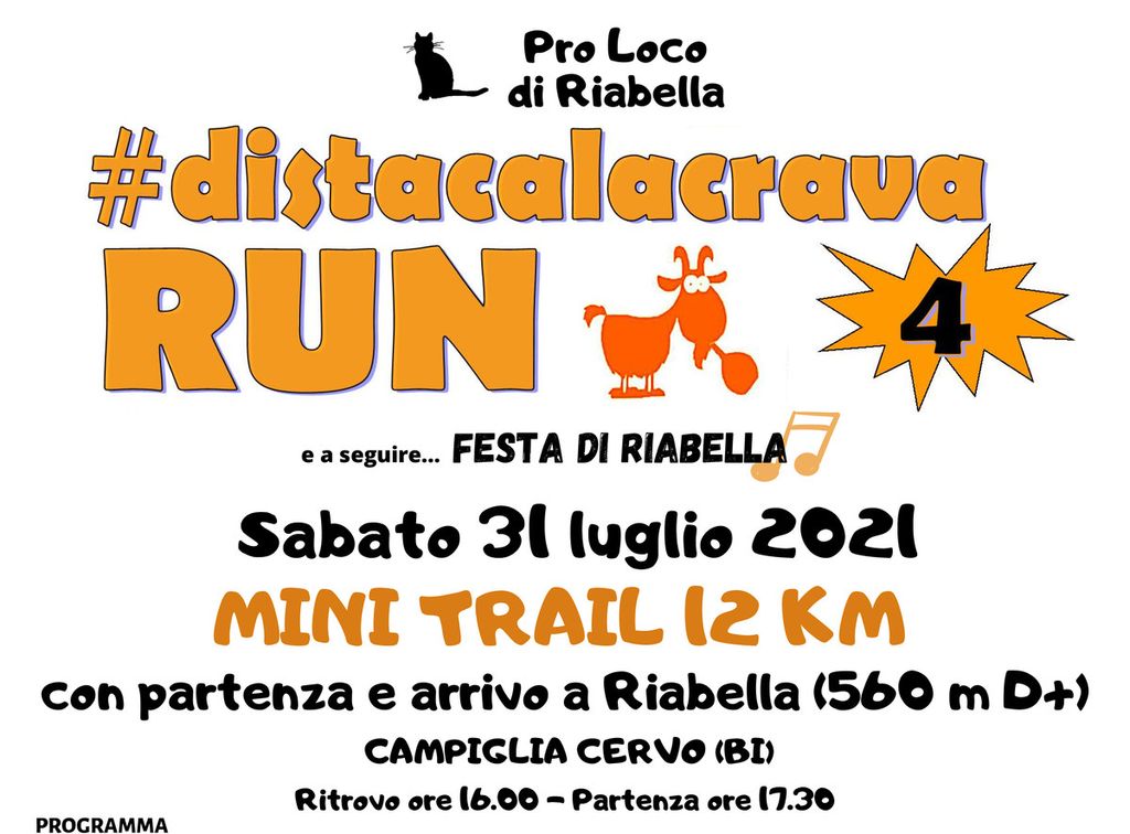 Dopo il grande successo delle prime tre edizioni domenica 1 agosto p.v. si terrà a Campiglia Cervo la quarta edizione della #distacalacrava RUN, minitrail non competitivo di circa 12 km organizzato dalla Pro Loco di Riabella con il patrocinio del Comune di Campiglia Cervo con partenza e arrivo a Riabella. Il titolo dell'iniziativa riprende il motto adottato dallo staff della Pro Loco ed è accompagnato da una capretta arancione, che compare in tutta la segnaletica del percorso, posata in maniera permanente lo scorso anno dai volontari dell’associazione.