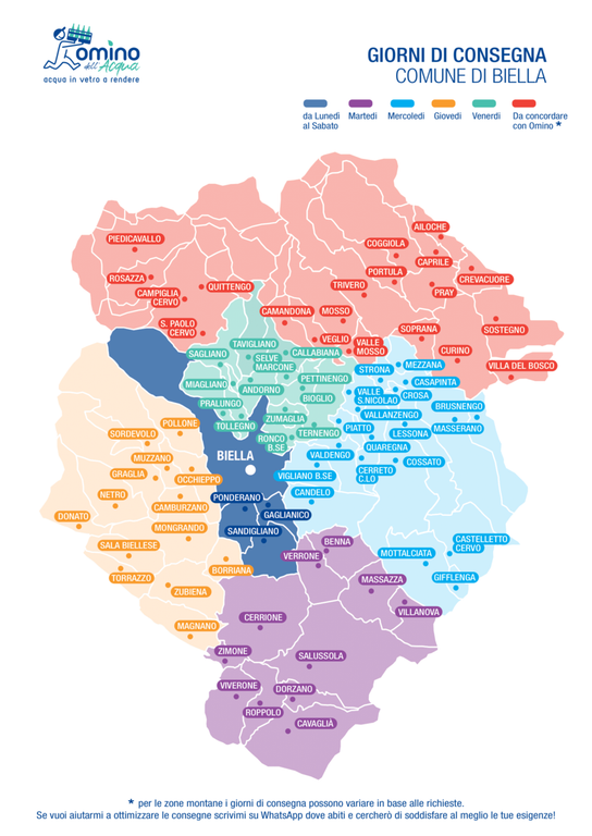 L’Omino dell’Acqua non permetterebbe mai di sprecare il carburante andando qua e là per il Biellese; per tutelare il più possibile l’ecosistema, l’Omino ha suddiviso i suoi giri in base alle zone, nelle quali passerà in giorni prestabiliti ogni settimana, evitando così di percorrere dei chilometri in eccesso. Attualmente le zone di consegna sono Biella, Ivrea, Novara e Vercelli.