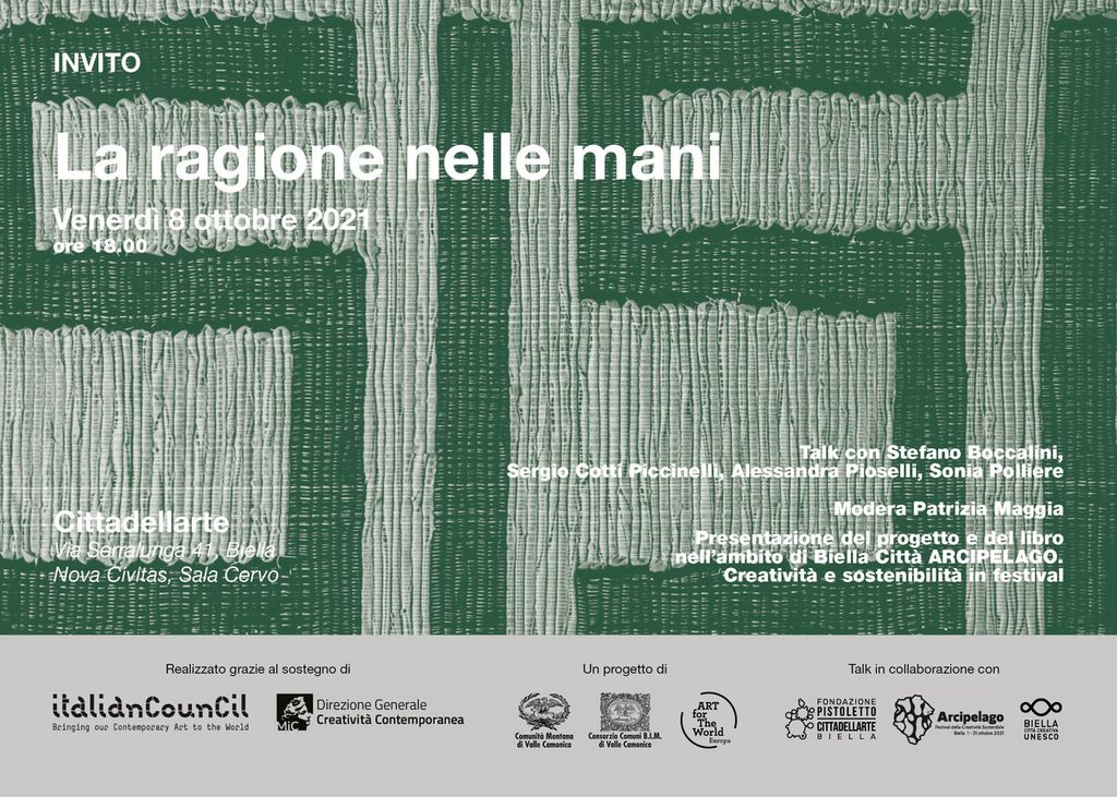Venerdì 8 ottobre 2021, nella cornice del Festival della Creatività sostenibile, Cittadellearte - Fondazione Pistoletto ospita il talk sul progetto e sul libro "La ragione nelle mani" di Stefano Boccalini, promosso da Comunità Montana di Valle Camonica e ART for The World Europa, vincitore della VIII edizione dell’Italian Council, il programma di promozione internazionale dell’arte contemporanea italiana della Direzione Generale Creatività Contemporanea del Ministero della Cultura.