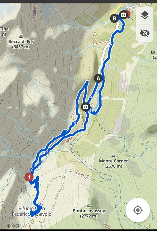 Si passa oltre la splendida cascata della Goletta, si attraversa la Dora di Rhemes su un agevole ponte e, dopo gli ultimi pochi chilometri di salita che si fa più ripida, si arriva al rifugio dedicato a Gian Federico Benevolo alpinista scomparso nel 1927 sul Colle di Bionassay nel Monte Bianco.