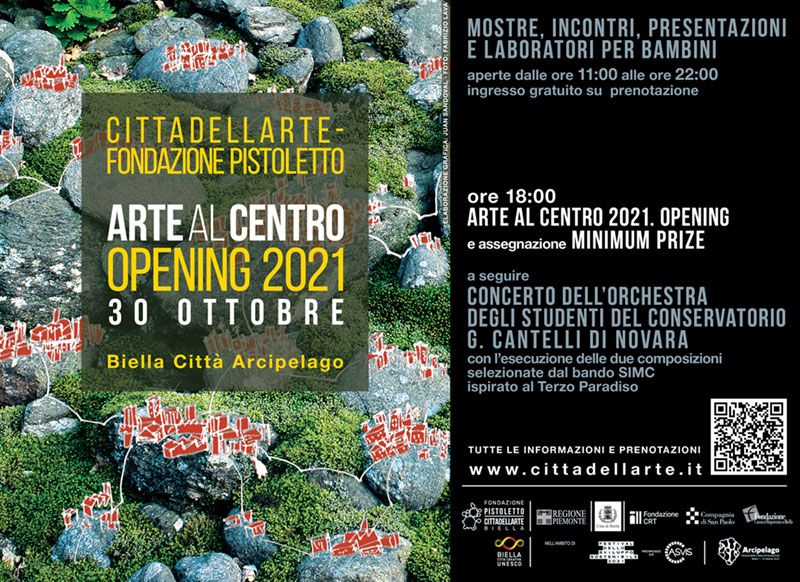 Sabato 30 il programma prevede alle 18 (Tettoia Concept) OPENING ARTE AL CENTRO 2021 e assegnazione MINIMUM PRIZEa seguire Concerto dell’orchestra del Conservatorio G. Cantelli di Novara con l’esecuzione delle due composizioni selezionate dal bando SIMC ispirato al Terzo Paradiso; 15:00 – 17:00 (spazio Semi Urbani) Open Studio “Corpi in piena”; 16:30 (Sala Love Difference – Spazio Terzo Paradiso, via Cernaia 46) Public talk “Tutta colpa dei neuroni specchio” Grammenos Mastrojeni (diplomatico e docente di Ambiente e Geostrategia) e Giuseppe Barbiero (docente di Biologia e di Ecopsicologia all’Università della Valle D’Aosta) in un dialogo condotto dall’artista Laura Pugno e dal curatore Andrea Lerda a partire dalle immagini di “Over Time”, progetto video di Laura Pugno in mostra ad Arte al Centro 2021; 17.30 (Spazio Terzo Paradiso, via Cernaia 46) la performance “Freedom”; 15:00-17:00 Laboratorio per bambini (6-11 anni).