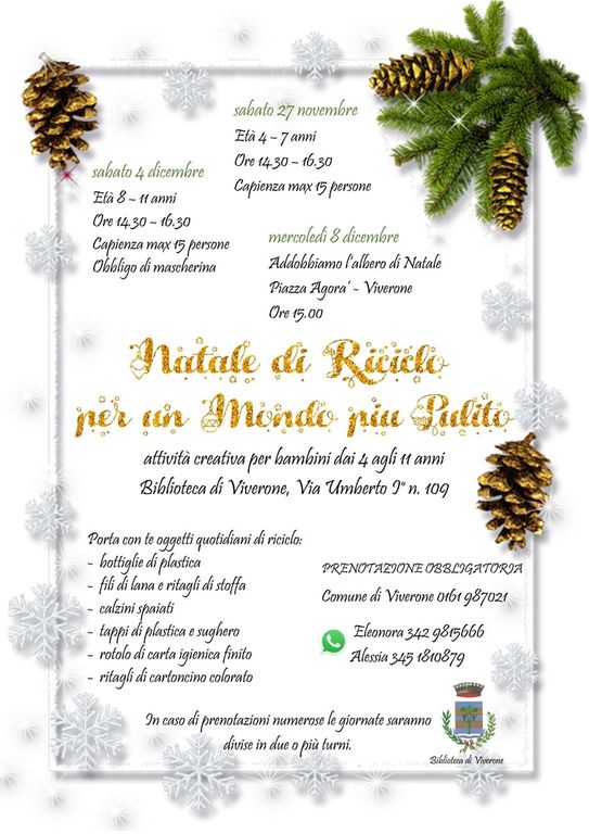 "Natale di Riciclo per un Mondo più Pulito" è il progetto del Comune di Viverone rivolto ai bambini tra 4 ed 11 anni per dare spazio alla fantasia nella creazione di addobbi per l’albero di Natale, utilizzando materiali quotidiani di scarto come bottiglie di plastica, fili di lana, ritagli di stoffa, calzini spaiati, tappi di plastica e sughero, rotoli di carta igienica finiti, ritagli di cartoncini colorati.