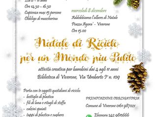 "Natale di Riciclo per un Mondo più Pulito" è il progetto del Comune di Viverone rivolto ai bambini tra 4 ed 11 anni per dare spazio alla fantasia nella creazione di addobbi per l’albero di Natale, utilizzando materiali quotidiani di scarto come bottiglie di plastica, fili di lana, ritagli di stoffa, calzini spaiati, tappi di plastica e sughero, rotoli di carta igienica finiti, ritagli di cartoncini colorati.