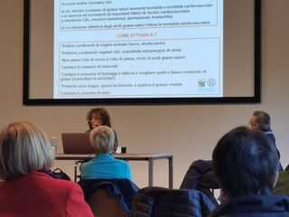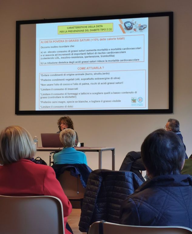 La relazione, preceduta da una breve presentazione del geriatra Debernardi, presidente di Anzitutto e di Pier Salivotti coorganizzatore locale, si è svolta davanti a una trentina di persone (capienza della sala secondo norme covid) . La dottoressa ha iniziato spiegando che ci sono due tipi di diabete, quello di tipo 1 una volta detto giovanile e quello di tipo 2 degli anziani. Quello di cui si è parlato è quello di tipo 2. La dottoressa ha premesso che lo zucchero nel sangue è presente ma oltre un certo livello può essere negativo per vari organi e per questo motivo va tenuto entro determinati valori. Nell'insorgenza del diabete 2 sono interessati diversi organi, non solo il pancreas, e quindi da alcuni anni sono comparsi nuovi farmaci che hanno azione non sul pancreas.