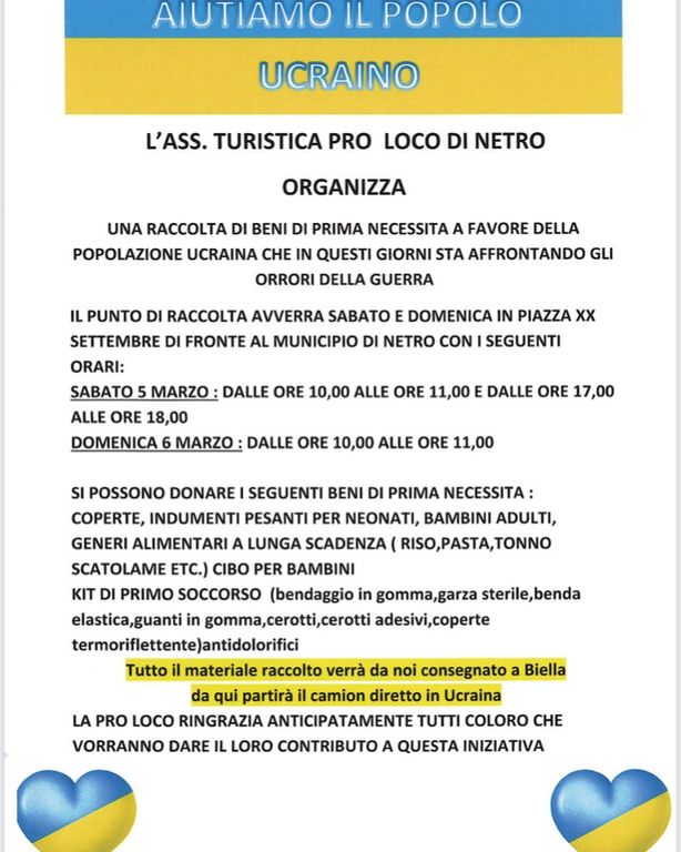 “Aiutiamo il popolo ucraino” è il titolo dell'iniziativa della Pro Loco di Netro per raccogliere beni di prima necessità a favore della popolazione ucraina che in questi giorni sta affrontando l'orrore della guerra a causa dell'invasione russa.