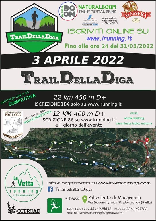 Un altro di weekend di grandi appuntamenti per gli appassionati di podismo con il ritorno del Trail targato “La Vetta Running”, giunto alla sua quinta edizione. Il Trail della diga avrà luogo domenica 3 aprile nel comune di Mongrando e, insieme alla consueta corsa competitiva di 22 km, ci sarà anche una camminata attraverso il bosco del Vallino per soddisfare le esigenze dei meno competitivi tra i partecipanti. La partenza dell’evento principale, la 22 km, è programmata per le ore 09:30, presso il polivalente di Mongrando, in via Giovanni Enrico 35, dopo il ritrovo delle ore 08 mentre, per quanto riguarda la 12 km, la partenza avverrà mezz’ora dopo, alle ore 10. L’iscrizione può essere effettuata sul sito www.irunning.it, alla prezzo di 8 euro ed entro le 24 del 31 marzo, oppure il giorno stesso della corsa.