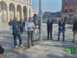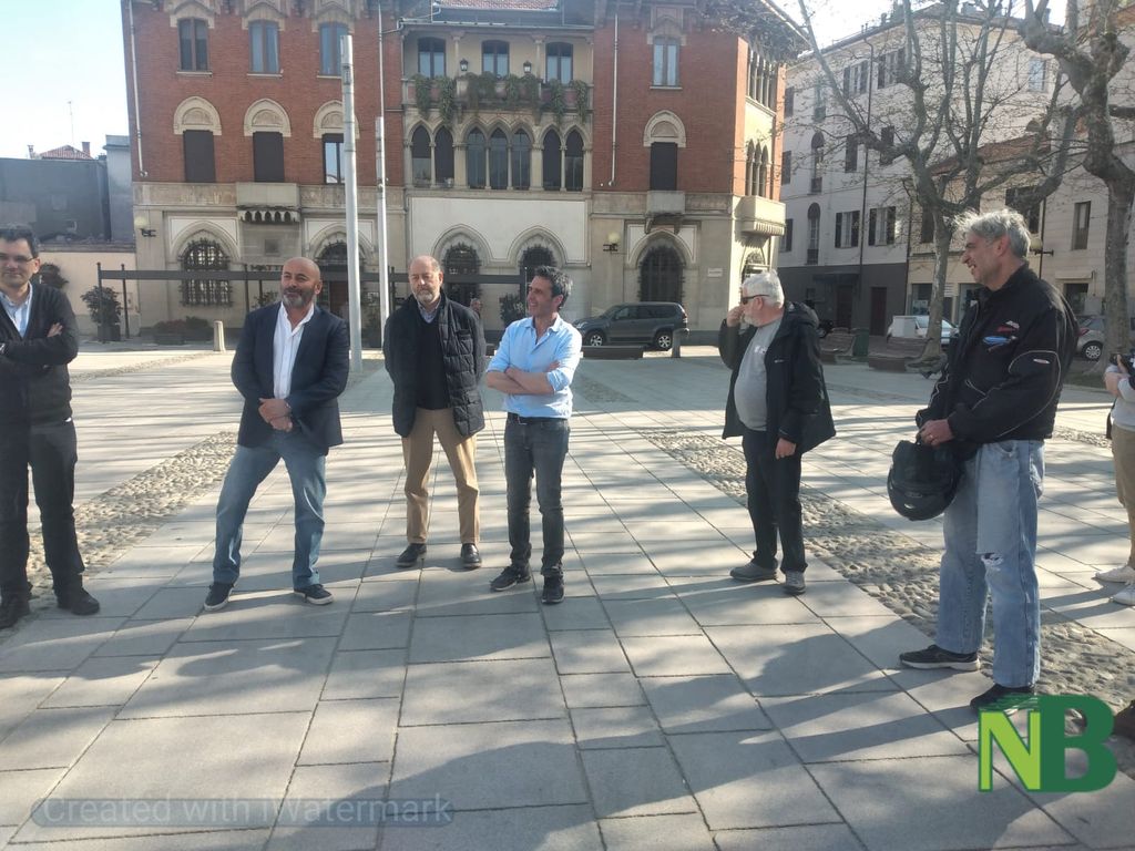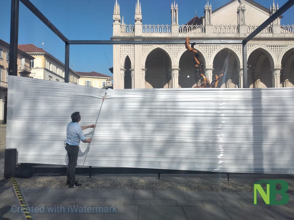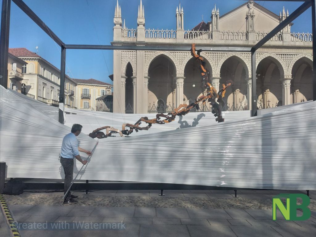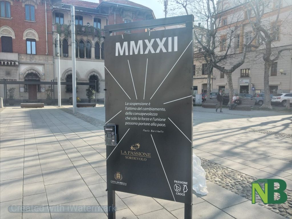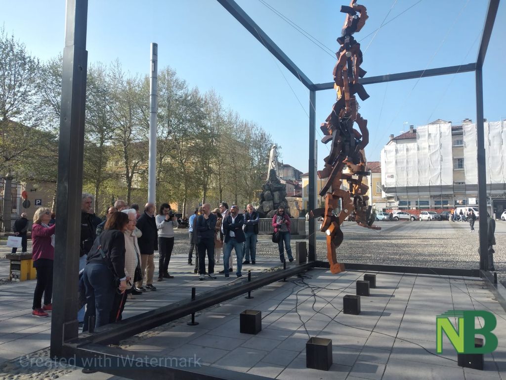 Presente l'assessore alla Cultura Massimiliano Gaggino per il Comune di Biella, il sindaco di Sordevolo Alberto Monticone, Don Paolo Boffa Sandalina e rappresentanti della Associazione Teatro Popolare di Sordevolo assieme ad alcuni attori della pluricentenaria tradizione teatrale corale della Passione di Cristo, l'artista biellese Paolo Barichello, oggi 14 aprile ha svelato in piazza Duomo la sua opera dedicata alla Passione.