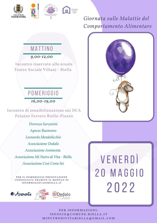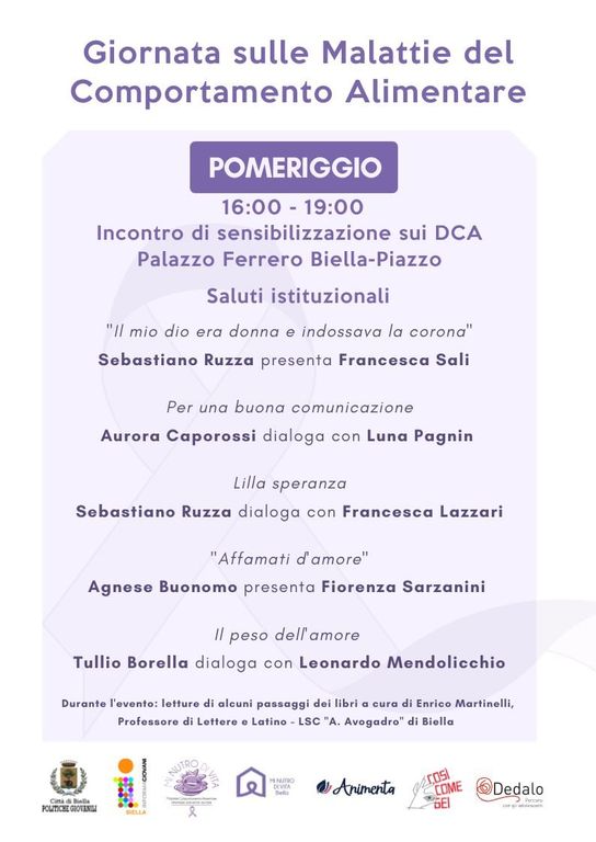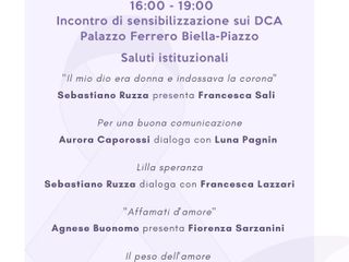 Venerdì 20 maggio nel comune di Biella sarà una giornata dedicata alle malattie del comportamento alimentare. Sono due gli appuntamenti in programma: al teatro sociale Villani, dalle ore 09 alle 12, si svolgerà un incontro riservato agli studenti mentre, dalle ore 16 alle19, palazzo Ferrero ospiterà il secondo incontro, aperto a tutti su prenotazione al sito www.informagiovanibiella.it.