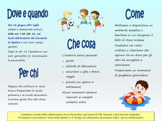 Il centro estivo è riservato a che ha frequentato la scuola primaria o la scuola secondaria di primo grado, fino alla classe seconda. Per info e iscrizioni, le quali termineranno venerdì 10 giugno è possibile telefonare a Giada 327.4036559.