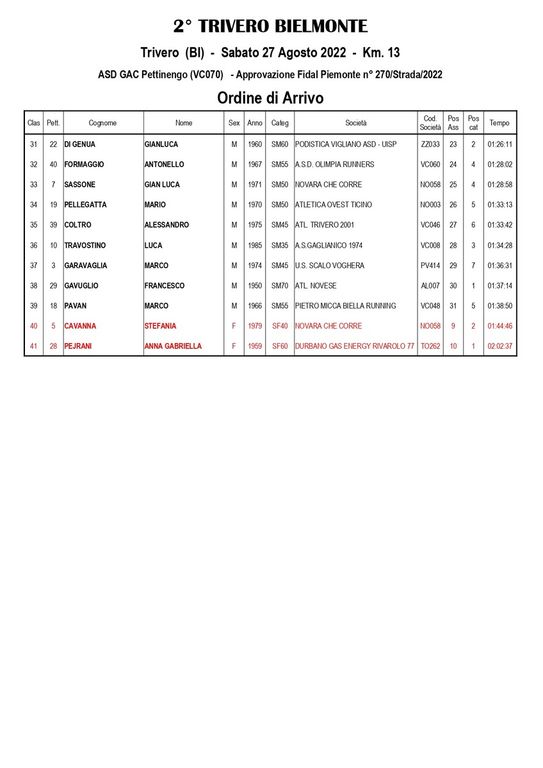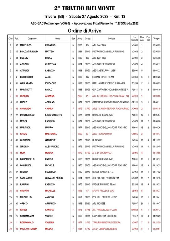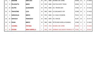 La biellese Arianna Reniero (Atletica Stronese Nuova NordAffari) ha chiuso, invece, in 1h03’55”, precedendo l’azzurra di skyrunning Chiara Giovando (Atl. Monterosa, 1h04’15”), Mastewal Ghisio (Atl. Saluzzo, 1h10’47”), Monica Moia (Bognanco, 1h12’58”) e Michelle Gnoato (Sport Project Vco, 1h19’37”).