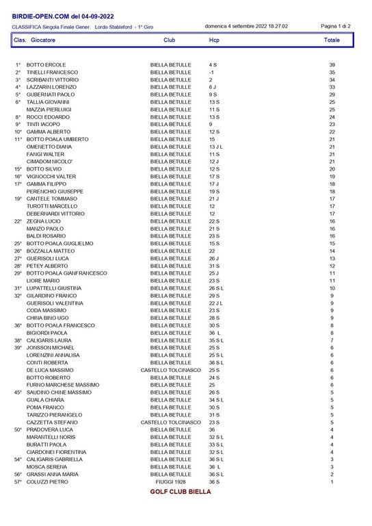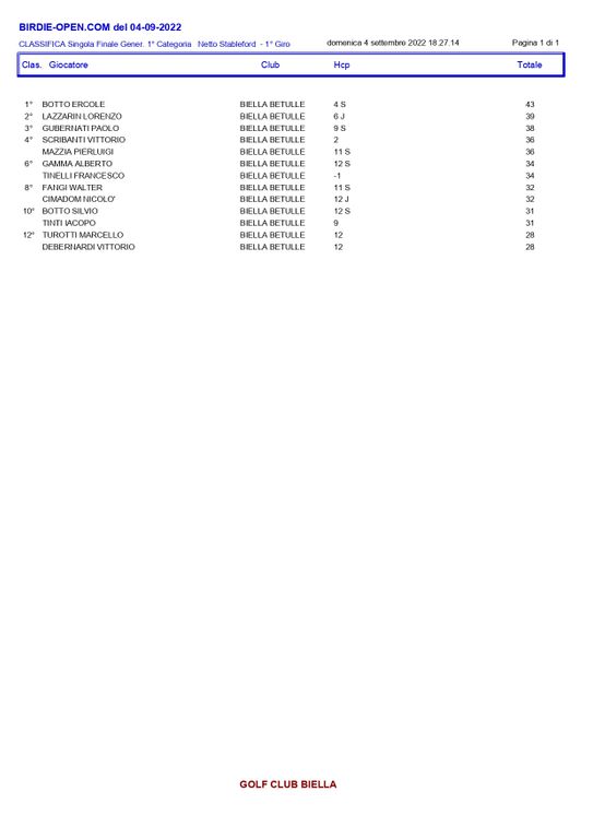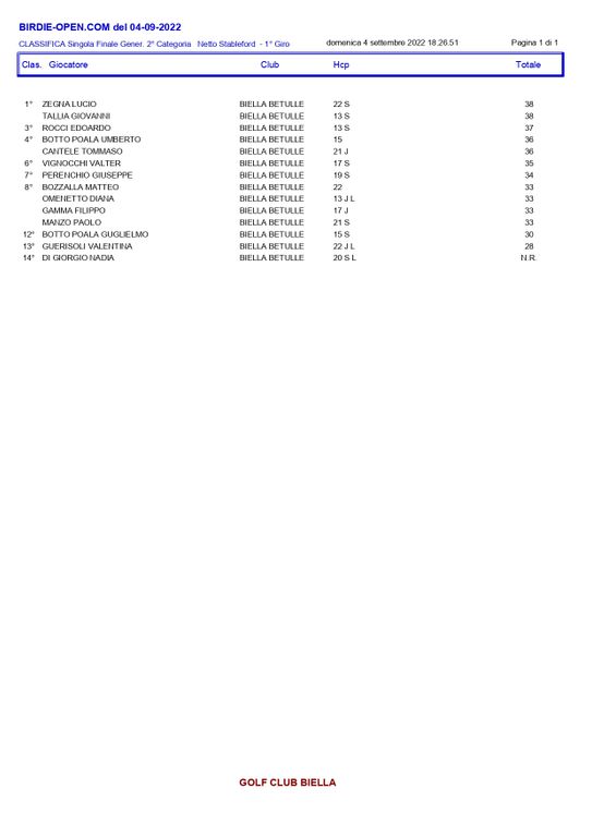 Questi i risultati: Nella 1° CATEGORIA 1° Lordo ERCOLE BOTTO BIELLA BETULLE 39; 1° Netto LORENZO LAZZARIN BIELLA BETULLE 39; 2° Netto PAOLO GUBERNATI BIELLA BETULLE 38. Nella 2° CATEGORIA 1° Netto LUCIO ZEGNA BIELLA BETULLE 38; 2° Netto GIOVANNI TALLIA BIELLA BETULLE 38. Nella 3° CATEGORIA 1° Netto ALBERTO PETEY BIELLA BETULLE 40; 2° Netto ROSARIO BALDI BIELLA BETULLE 37: Nella 1° Ladies LAURA CALIGARIS BIELLA BETULLE 34; 1° Juniores TOMMASO CANTELE BIELLA BETULLE 36; 1° Seniores EDOARDO ROCCI BIELLA BETULLE 37; Driving Contest Buca 9 BOTTO SILVIO BIELLA; Nearest Maschile Buca 2 TINTI IACOPO BIELLA mt. 3,60
