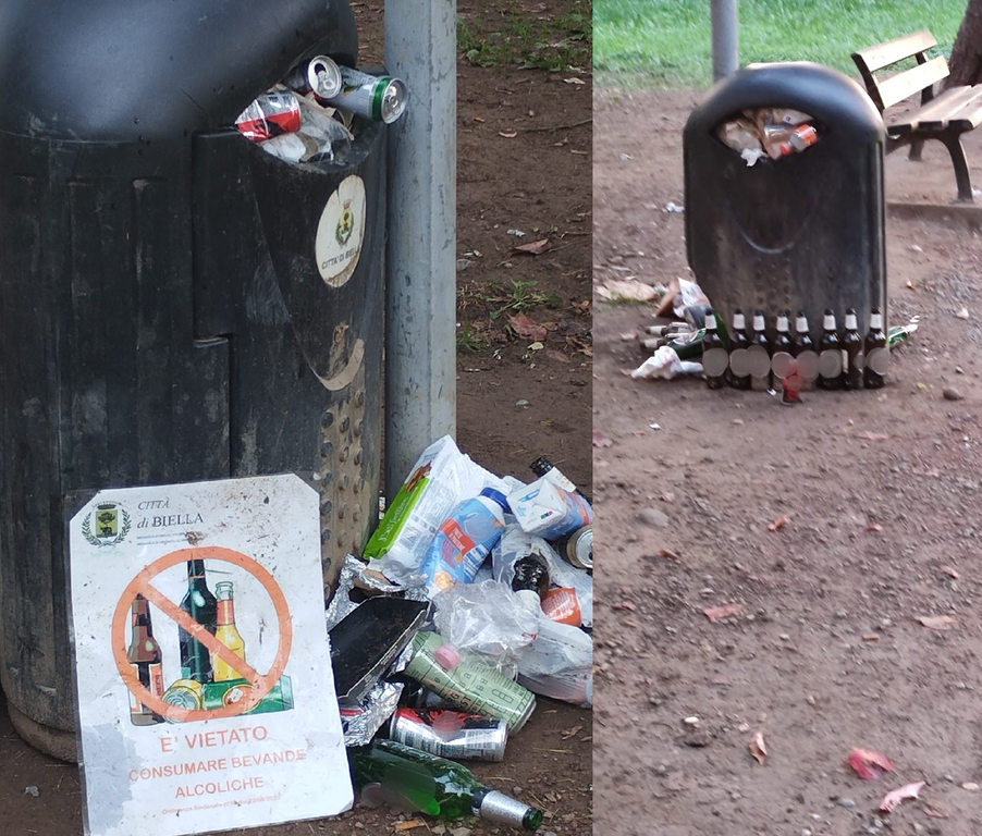 Cumuli di rifiuti gettati a terra, cartelli di divieto divelti e tante bottiglie abbandonate, nonostante sia ancora in vigore un’ordinanza comunale che vieta il consumo di bevande alcoliche nell’area pubblica del Parco della Rovere di Biella.