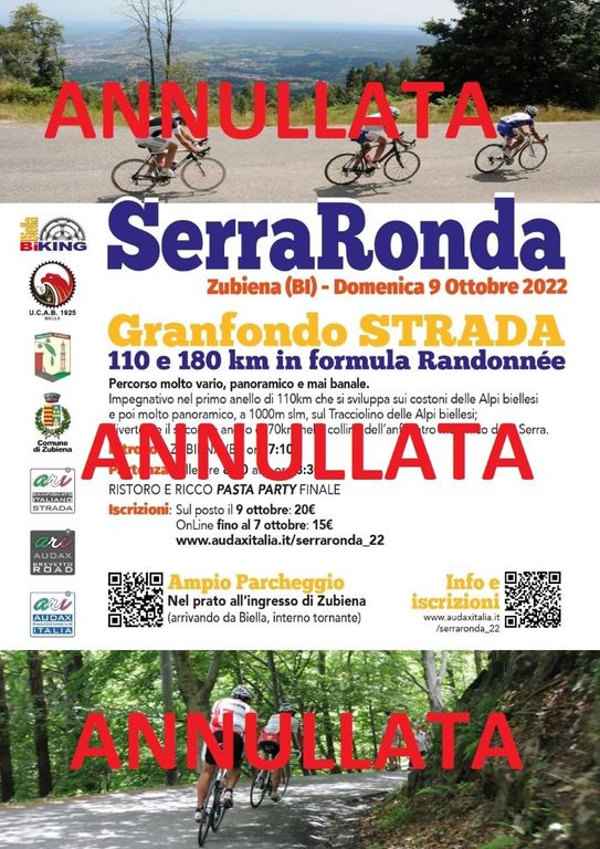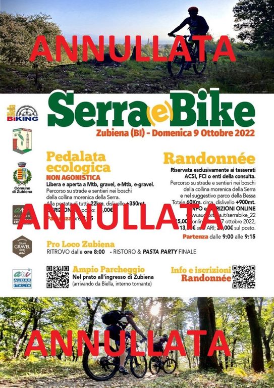 Pessime notizie per gli amanti delle due ruote. A causa delle previsioni meteo avverse, il doppio appuntamento di domani, domenica 9 ottobre, a Zubiena è stato annullato: non si svolgerà, quindi, la Serra(e)Bike e la SerraRonda. Lo comunicano gli organizzatori con una nota stampa ufficiale.