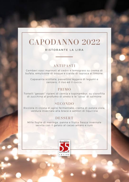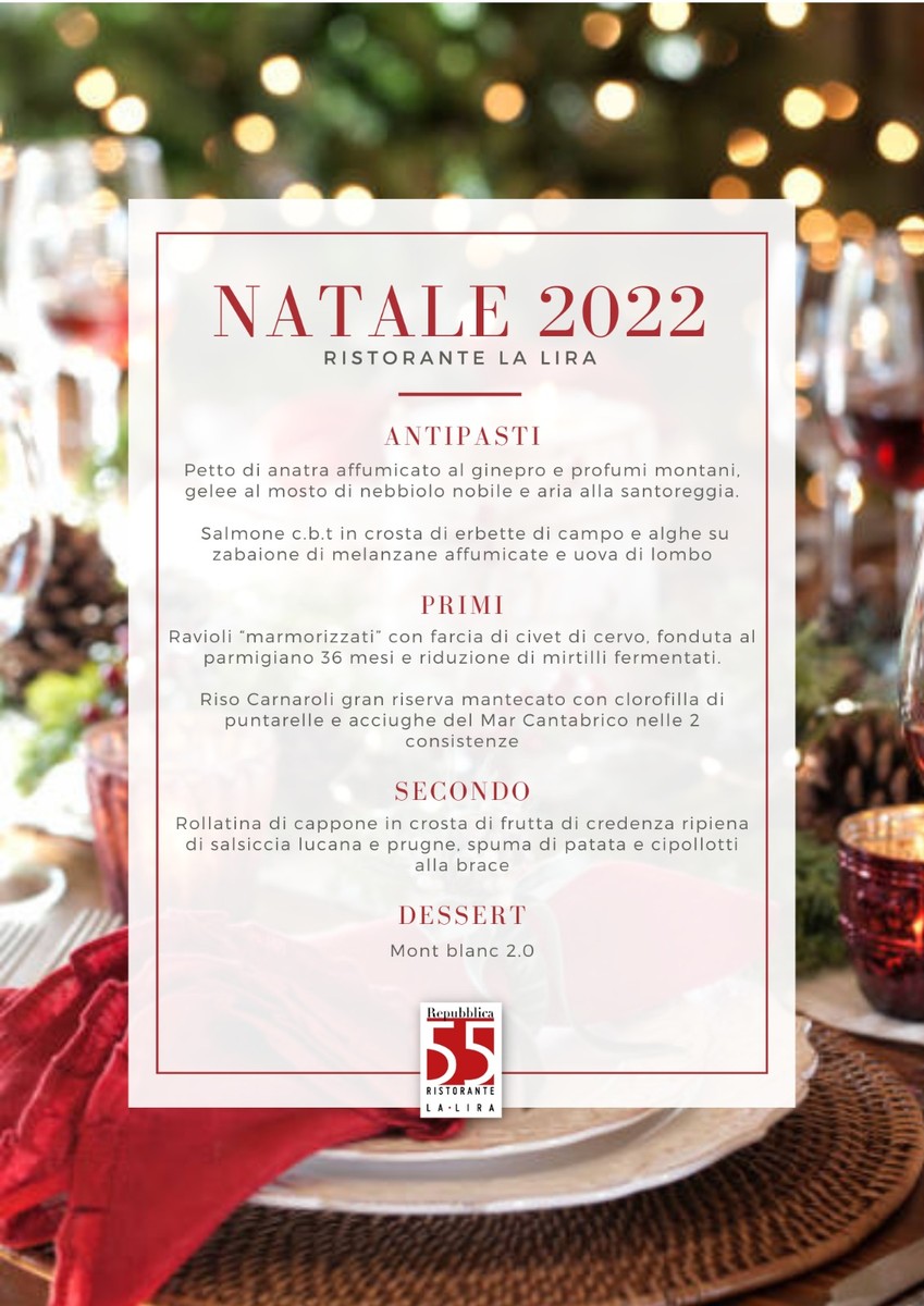 Per il Natale 2022 il Ristorante La Lira dal 24 al 26 dicembre fino ad esaurimento posti propone: come antipasto Petto di anatra affumicato al ginepro e profumi montani, gelé al mosto di nebbiolo nobile e aria alla santoreggia, salmone c.b.t in crosta di erbette di campo e alghe su zabaione di melanzane affumicate e uova di lombo. I Primi Piatti: Ravioli “marmorizzati” con farcia di civet di cervo, fonduta al parmigiano 36 mesi e riduzione di mirtilli fermentati; Riso Carnaroli gran riserva mantecato con clorofilla di puntarelle e acciughe del Mar Cantabrico nelle 2 consistenze. Di secondo Rollatina di cappone in crosta di frutta di credenza ripiena di salsiccia lucana e prugne, spuma di patata e cipollitti alla brace e come dolce Mont blanc 2.0.