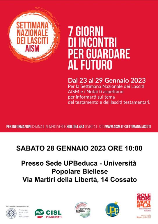 Anche la Sezione Provinciale AISM di Biella partecipa all’evento: sabato 28 gennaio alle ore 10.00 presso la Sede UPBeduca - Università Popolare Biellese - verrà realizzato anche un incontro locale a Cossato (BI) in Via Martiri della Libertà 14 , in collaborazione con l’Università Popolare Biellese, durante il quale il Notaio Pierlevino Rajani – Presidente - approfondirà i temi della successione, del testamento e del lascito solidale, rispondendo alle domande dei presenti.