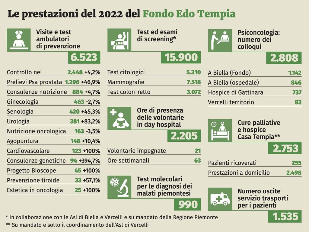 «Sono numeri» rimarca Viola Erdini, presidente della Fondazione Tempia «che confermano il peso dei nostri laboratori di genomica e oncologia molecolare. Sono nati per la ricerca, un settore in cui raggiungono risultati di rilievo anno dopo anno in collaborazione con il mondo della scienza e della medicina. Ma è essenziale il sostegno al lavoro quotidiano dei medici per rendere sempre più personalizzate le terapie attraverso la diagnosi». L’accompagnamento al fine vita per i pazienti per i quali scienza e medicina non può fare altro si esprime nel lavoro dello staff messo a disposizione della struttura di cure palliative dell’Asl di Biella e in quello dell’hospice Casa Tempia di Gattinara, gestito sotto la supervisione e il coordinamento dell’azienda sanitaria di Vercelli. Qui in un anno sono stati accolti 255 malati mentre ben più numerose, e in crescita rispetto al 2021, sono state le terapie a domicilio: 2.498 in dodici mesi in tutto il territorio vercellese. Prendersi cura significa occuparsi della persona e non solo della malattia: il Fondo Edo Tempia realizza questo proposito ogni giorno anche grazie al lavoro del centro di ascolto psicologico e delle professioniste messe a disposizione delle aziende sanitarie a Biella e Vercelli e all’hospice di Gattinara.