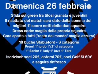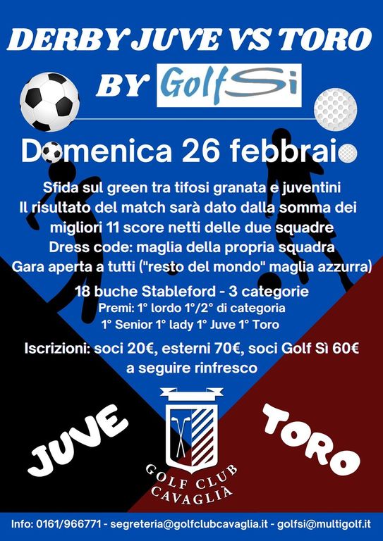 Questo weekend al Golf Cavaglià sarà dedicato ad un altro evento agonistico/goliardico. Domenica si disputerà infatti il "Derby Juve vs Toro by Golf Sì" sfida sul green tra tifosi granata e juventini a due giorni dal match calcistico di serie A. La gara è aperta a tutti (18 buche Stableford 3 categorie - iscrizioni: soci 20€, esterni 70€, soci Golf Sì 60€) e valida per l’handicap, mentre il risultato della sfida sarà data dalla somma dei migliori 11 score netti delle due squadre (dress code: maglia della propria squadra). Previsti gadgets e premi speciali. Dopo la premiazione a seguire rinfresco.
