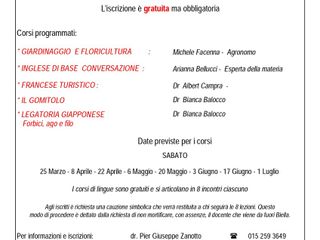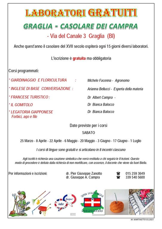 Tornano da domani, sabato 25 marzo, i laboratori gratuiti al Casolare dei Campra di Graglia (via del Canale 3), che quest'anno si occuperanno di giardinaggio e floricoltura, inglese base di conversazione, francese turistico, gomitolo, legatoria giapponese (forbici, ago e filo).