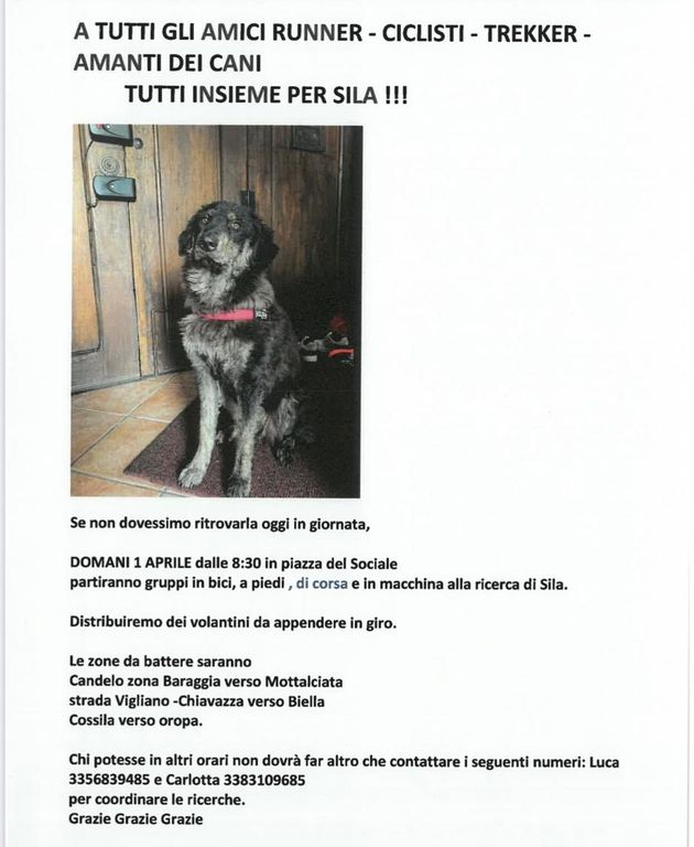 Il ritrovo sarò alle 8,30 in piazza del Sociale, partiranno gruppi in bici, a piedi, di corsa e in auto alla ricerca di Sila. Le zone da battere saranno Candelo zona Baraggia verso Mottalciata, strada Vigliano Chiavazza verso Biella e Cossila verso Oropa.