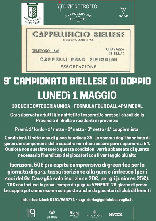 Al Golf Cavaglià il mese di maggio si aprirà lunedì 1 con il Campionato Biellese di doppio giunto alla 9a edizione. La gara, che sarà sponsorizzata dal Cappellificio Biellese 1935, vedrà i partecipanti si sfidarsi in una gara a coppie sulla distanza di 18 buche con formula “four ball" 4pm (medal). Campioni uscenti Giovanni Tallia/Gabriele Davi nel lordo e Daniele Tonso/Mauro Ariel Blanc nel netto.