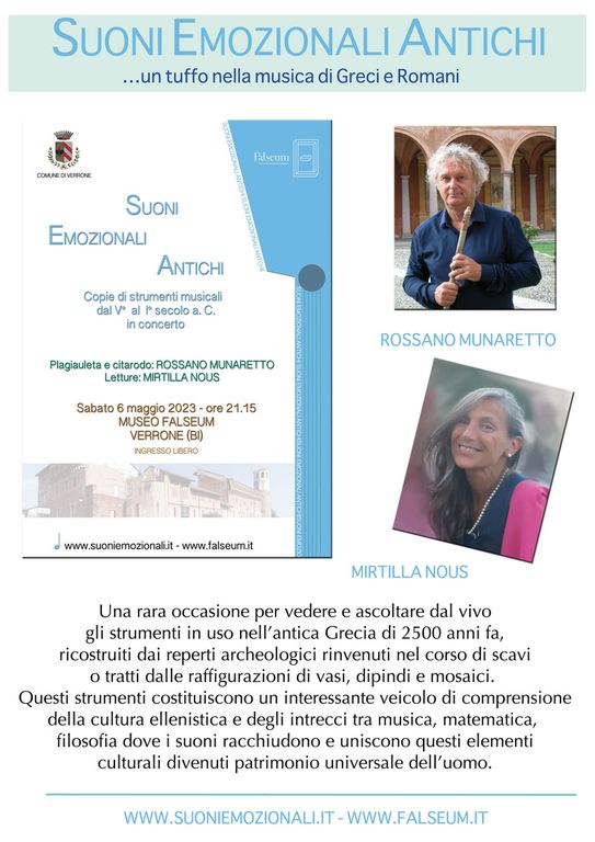 La Grecia antica è il luogo principale dello sviluppo delle arti attraverso la mousikè e proprio da quella cultura sono nati gli strumenti musicali che si potranno ascoltare nel concerto, spesso solamente osservati nelle raffigurazioni pittoriche e vascolari senza la possibilità di comprenderne le caratteristiche esecutive. In questa occasione queste straordinarie e fedeli riproduzioni di reperti archeologici originali - ricostruiti tra collaborazione di ricercatori e docenti dell'Università di Atene ed uno studio di Rossano Munaretto su una replica di Tibia obliqua di epoca romana custodita al British Museum di Londra, raro e inedito strumento destinato ai riti dionisiaci – daranno vita ad un percorso musicale attraverso l'esecuzione di frammenti originali di epoca ellenistica e romana e composizioni appositamente ispirate alla poesia e lirica greca-romana.