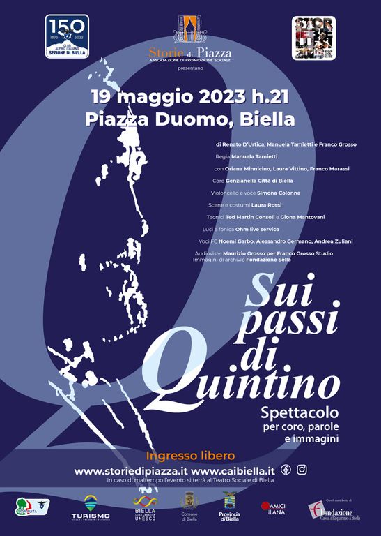 L’apertura dei festeggiamenti avverrà il 19 maggio in Piazza Duomo a Biella con diversi eventi pomeridiani e, alle h.21, lo spettacolo di Storie di Piazza aps organizzato dal CAI di Biella, in collaborazione col Centro Nazionale Coralità del CAI: Sui passi di Quintino, di Renato D’Urtica, Manuela Tamietti e Franco Grosso. Con Oriana Minnicino, Laura Vittino e Franco Marassi.