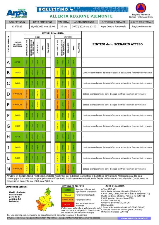 Il bollettino emesso poco fa da Arpa Piemonte dispone allerta arancione per rischio idrogeologico e idraulico in Alta val Susa e nelle valli Chisone, Pellice, Varaita, Maira e Stura, in estensione nella giornata di domani alla pianura cuneese.