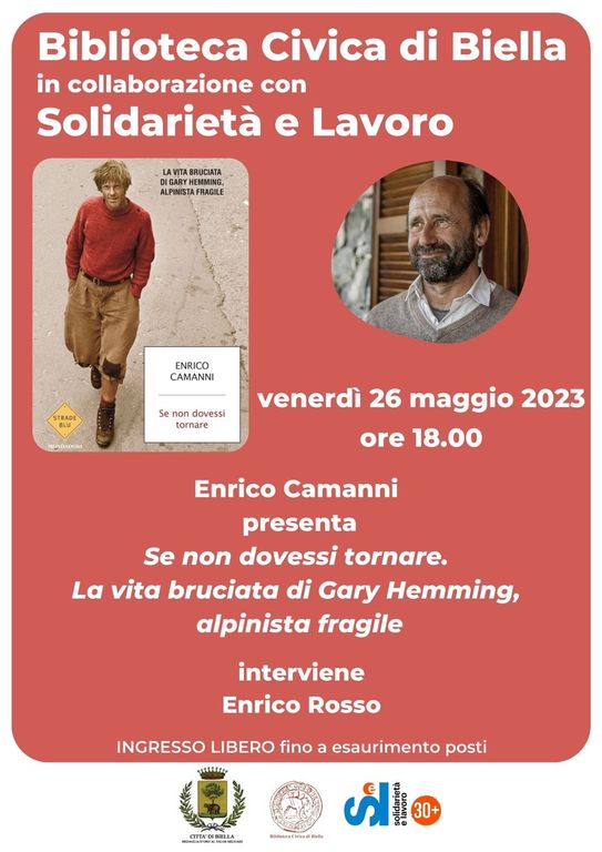 Venerdì 26 maggio alle ore 18.00 alla Biblioteca Civica di Biella, l’autore Enrico Camanni presenterà il libro “Se non dovessi tornare. La vita bruciata di Gary Hemming, alpinista fragile” (Strade Blu Mondadori) e dialogherà con Enrico Rosso, alpinista e guida alpina di Biella.