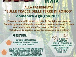 Si terrà domenica 4 giugno, l’inaugurazione d’apertura per la stagione estiva, che aprirà con la passeggiata “Sulle tracce delle terre di Ronco”. Lungo il percorso adatto a tutta la famiglia, verrete accompagnati da Valeria Tonella: guida ambientale ed escursionistica e maestra di “Tornio Zen” alla Scuola delle Terrecotte di Ronco Biellese.