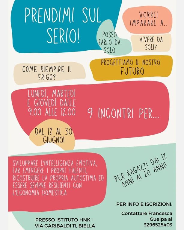 Il secondo è ”Prendimi sul serio!”, un corso per ragazzi dai 12 ai 20 anni svilupperanno l'intelligenza emotiva, faranno emergere i propri talenti, ricostruiranno la propria autostima ed essere sempre resilienti con l'economia domestica.