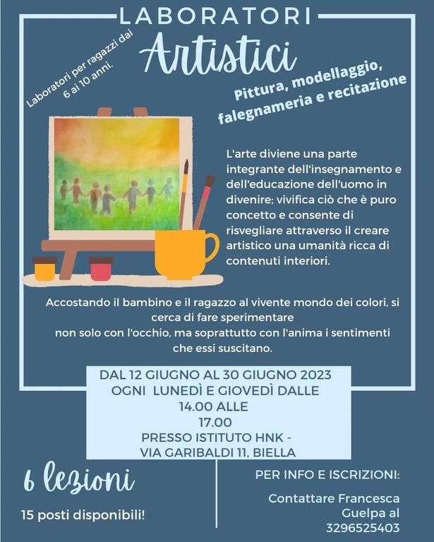 Il primo è un laboratorio artistico di pittura, modellaggio, falegnameria e recitazione, in cui bambini dai 6 ai 10 anni si avvicinano al mondo dei colori, sperimentando non solo con l'occhio, ma soprattutto con l'anima i sentimenti che essi suscitano. L'arte, infatti, è parte integrante dell'insegnamento e dell'educazione dell'uomo in divenire: vivifica ciò che è puro concetto e consente di risvegliare, attraverso il creare artistico una umanità ricca di contenuti interiori.