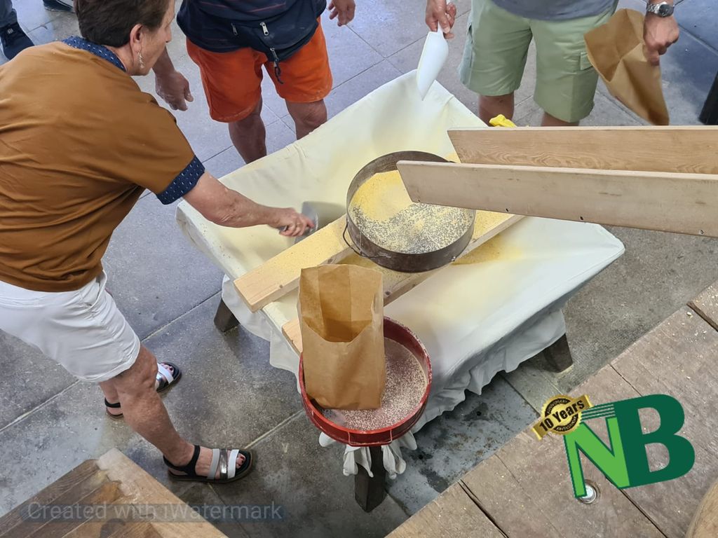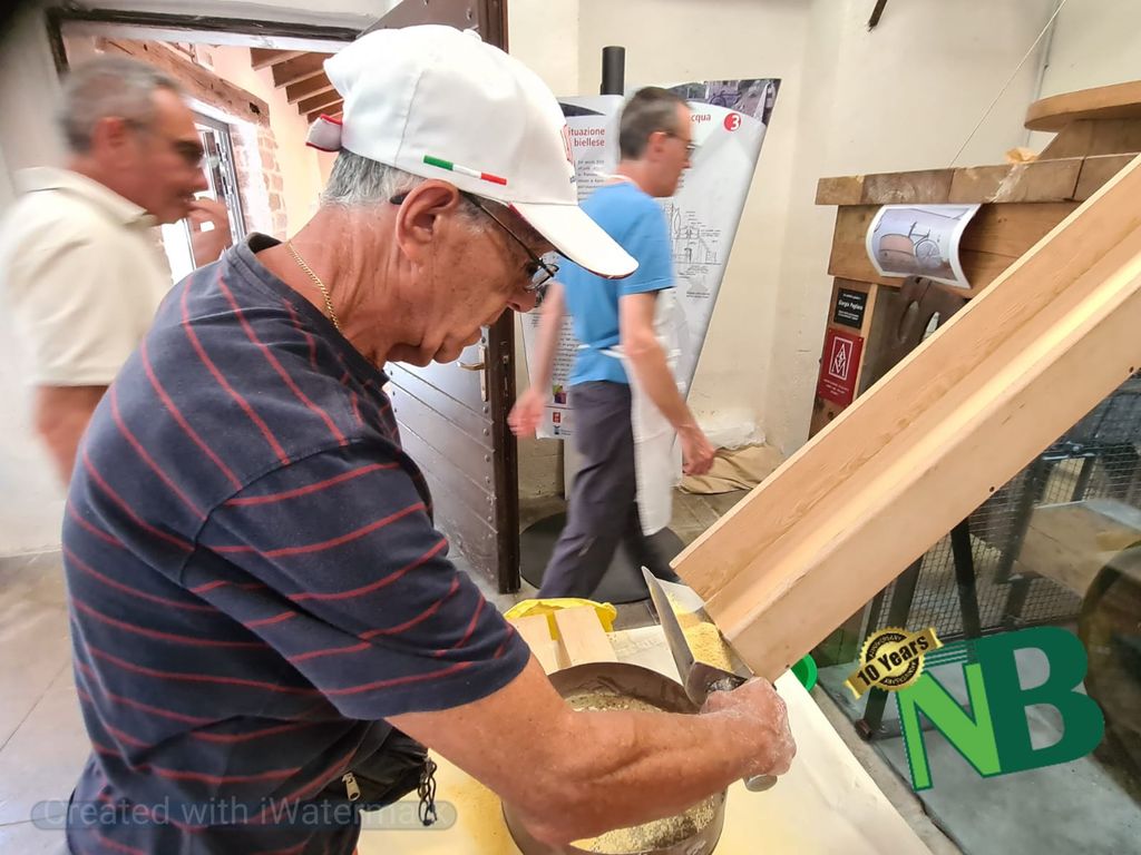 La paratia della lanca che raccoglie l'acqua dell'Ostola è stata aperta e convogliata sulle pale del mulino che, girando, ha messo in moto la macina, tenuta d'occhio dal mugnaio, ed ha prodotto diversi chili di farina gialla imbustati e pronti per arrivare nelle cucine.