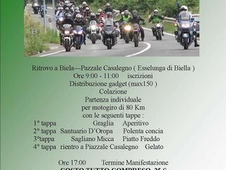 Domenica 23 luglio andrà in scena il Motogiro del Biellese, gita motociclistica di circa 80 chilometri che porterà i partecipanti, provenienti da tutto il Piemonte ("e non solo!", precisano gli organizzatori), alla scoperta dei principali Santuari del Biellese.