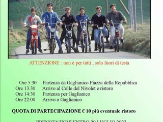 Giovedì 27 luglio, cioè nemmeno una settimana dopo il Motogiro del Biellese, l'organizzazione del MotoClub Perazzone - Cavallini e di AMSAP sarà nuovamente impegnata nella gestione di un evento un po' "particolare": la salita al Colle del Nivolet riservata ai Piaggio Ciao e agli altri ciclomotori a frizione automatica e pedali (quindi non i "cinquantini" con le marce).