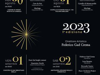 - “Il grande concerto di apertura”, Biella, Teatro Sociale Villani - (28 agosto 2023, ore 21:00) – Federico Gad Crema, Pianoforte; Aubree Oliverson, Violino; Giuseppe Mengoli, Direttore d’orchestra.