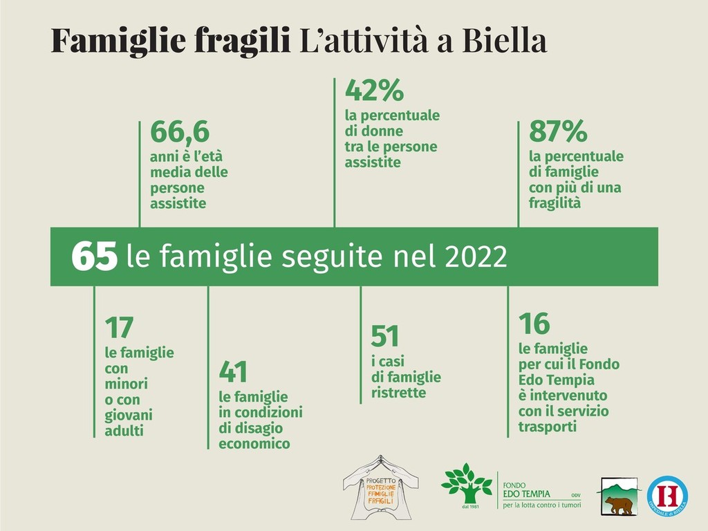 Sono 65 i casi che hanno richiesto, nel 2022, l’intervento del Progetto protezione famiglie fragili: tra di loro ci sono persone sole o che si devono occupare di un congiunto malato o disabile, situazioni rese complicate dall’abuso di droga o di alcol, nuclei con difficoltà di integrazione linguistica o culturale o, più semplicemente o altrettanto drammaticamente, vicende in cui pesa l’instabilità economica. Il progetto è nato nel 2002 da un’iniziativa della Rete oncologica di Piemonte e Valle d’Aosta e dal 2018 nel Biellese ha visto impegnarsi in prima persona l’Asl e il Fondo Edo Tempia.