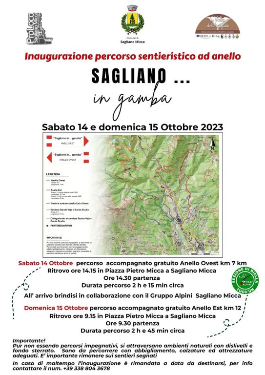 Sabato 14 e domenica 15 ottobre, a Sagliano si cammina. Nel fine settimana verrà inaugurato il percorso sentieristico denominato Sagliano in...gamba, organizzato da dalla Pro Loco di Sagliano Micca, il Comune e la sezione Alpini di Biella.