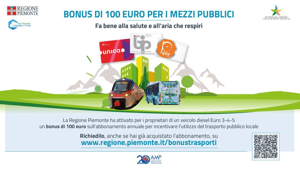 Iniziata l’operazione “Bonus trasporti” della Regione Piemonte: a disposizione dei possessori di veicoli diesel Euro 3, 4 e 5 o dei loro famigliari ci sono 100.000 buoni da 100 euro ciascuno da utilizzare per l’acquisto degli abbonamenti annuali a bus, treni e metropolitana e per gli abbonamenti plurimensili studenti, oltre che il rimborso di quelli comprati con data di inizio validità dal 1° settembre.