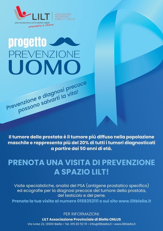 A novembre, periodo dell’anno dedicato alla prevenzione dei tumori maschili, torna “Progetto Prevenzione Uomo”, l’iniziativa territoriale di LILT Biella legata alla campagna nazionale "LILT for Men - Percorso Azzurro" - in programma dal 18 al 26 novembre - per la sensibilizzazione dedicata alle patologie tumorali della sfera genitale maschile.