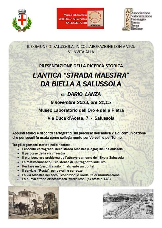 • avvicinandosi ai tempi nostri, l’evoluzione e il declino della “Via Regia” in favore della S.S. 143 “Vercellese” L'evento avrà luogo nella sala multimediale del Museo Laboratorio dell’Oro e della Pietra, a Salussola Monte, via Duca d’Aosta 7.